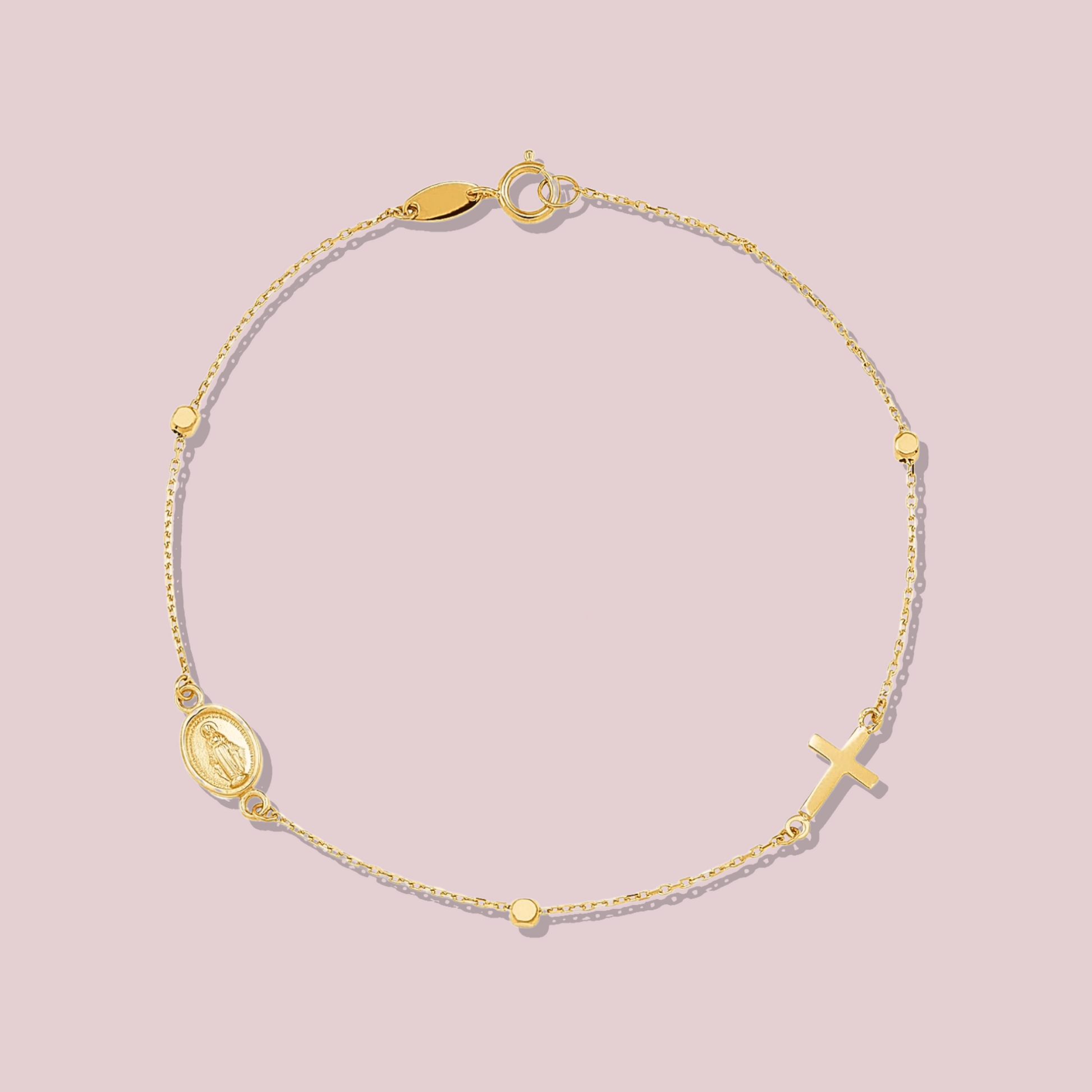 Expertly crafted from 14k solid gold, this rosary bracelet offers a unique and delicate design that holds special meaning. The perfect accessory for any religious individual, it serves as a constant reminder of faith and devotion. Elevate your jewelry collection with this thoughtfully crafted piece.